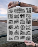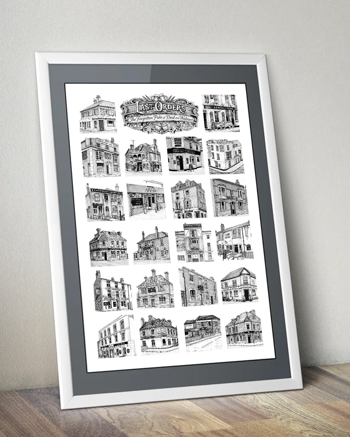 Hand drawn tribute to 22 of Deal and Walmer's lost pubs! This project took months and is made up of twenty-two individual pen drawings of pubs in Deal and Walmer that exist now only in our memories. Here are the pubs depicted on this print: