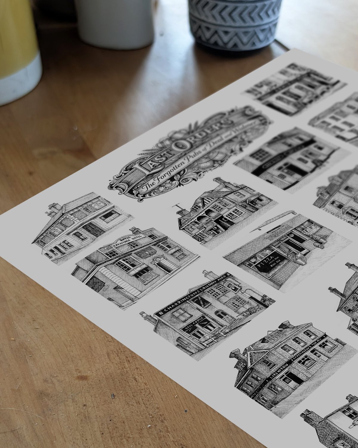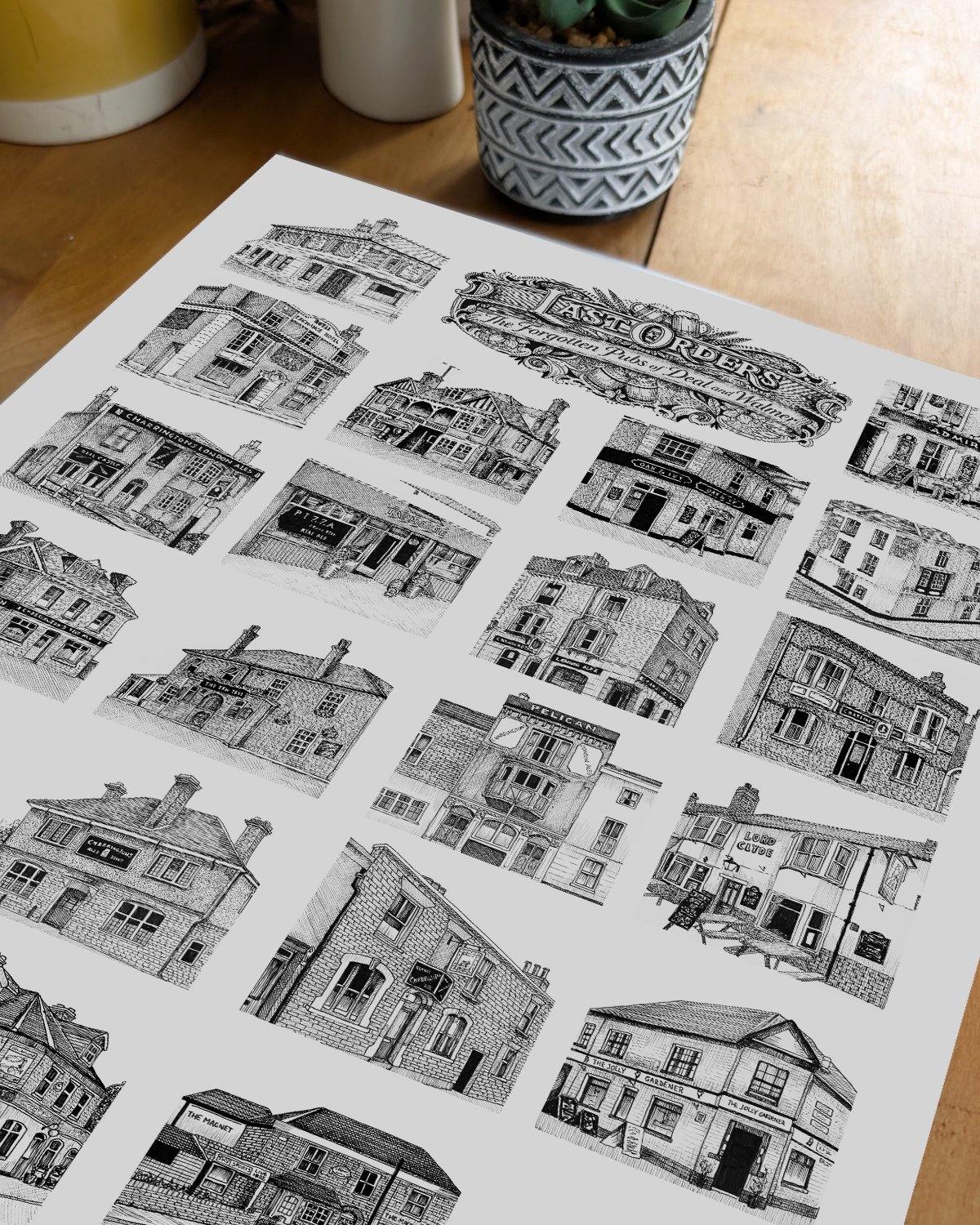 Each drawing is meticulously recreated using a variety of fineliner pens. The print also has a special hand drawn title to give it that vintage pub poster feel.