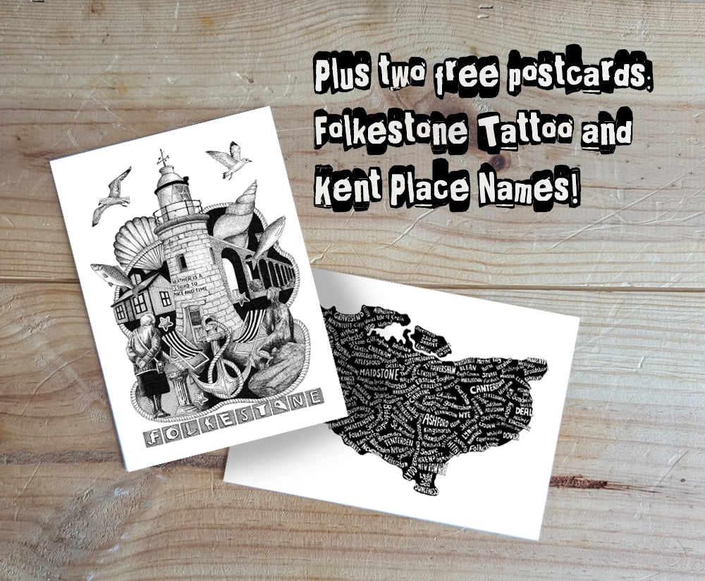 What's more, you also get two free postcards: Folkestone Tattoo style drawing and Kent Place Names.